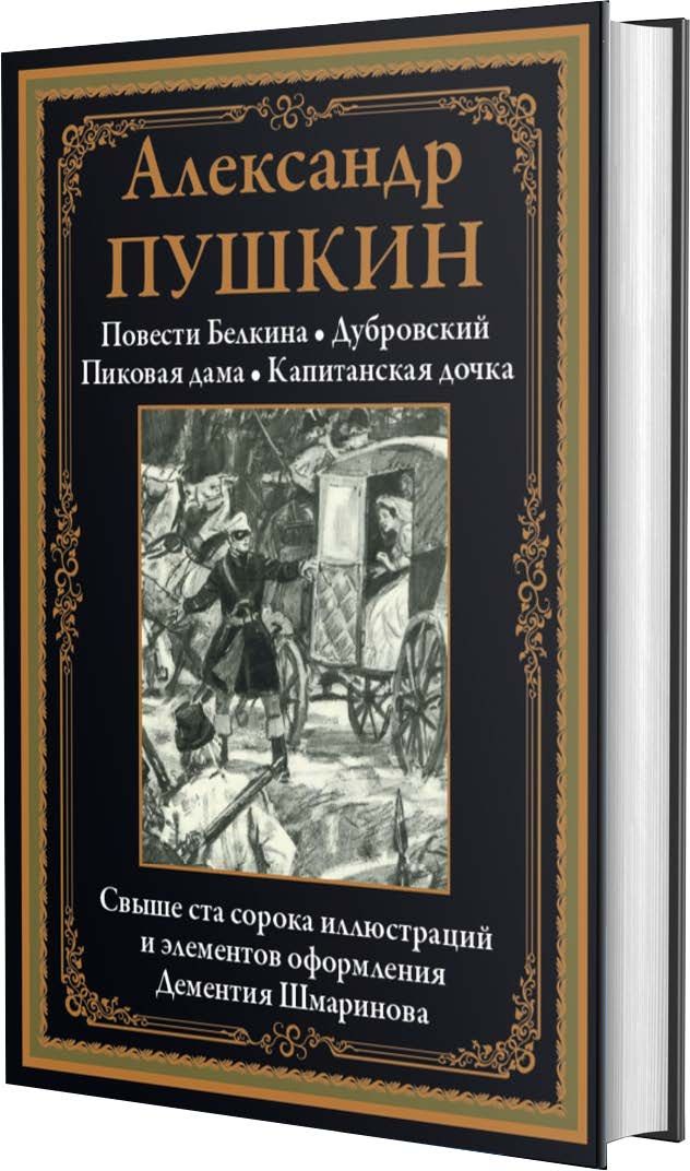 В настоящее издание вошли прозаические произведения великого русского поэта Александра Сергеевича Пушкина: цикл «Повести покойного Ивана Петровича Белкина», роман «Дубровский», повесть «Пиковая дама» и роман «Капитанская дочка». Талантливую и увлекательную прозу Пушкина дополняют выразительные работы признанного мастера книжной графики, замечательного живописца, плакатиста и педагога Дементия Шмаринова. Его работы достоверно передают детали описываемой эпохи, а также характеры и чувства изображаемых им героев.